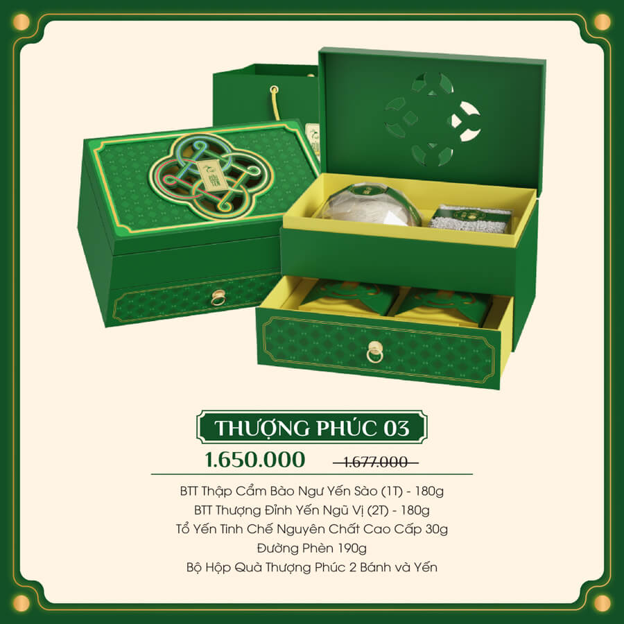 Combo Thượng Phúc 03 là biểu tượng của sự đủ đầy, gửi trao phúc lành và lời chúc sức khỏe trong mỗi chiếc bánh, mỗi tổ yến. Với thiết kế tinh xảo, nguyên liệu cao cấp và tinh thần tôn vinh giá trị truyền thống, món quà này không chỉ khiến người nhận cảm động mà còn thể hiện đẳng cấp và sự tinh tế của người tặng.