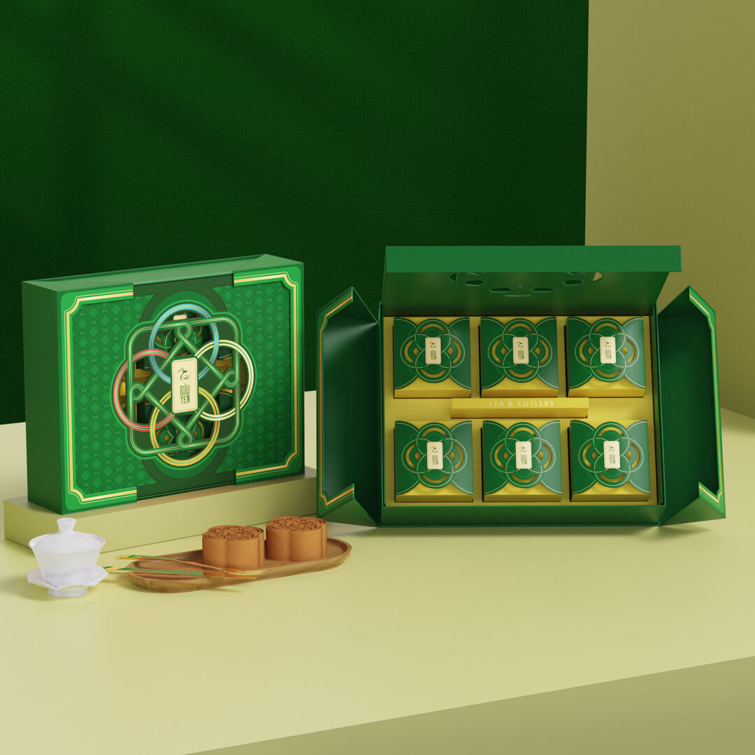 Tông màu xanh sẫm phối ánh vàng kim tôn lên nét thanh lịch – trang nhã. Thiết kế hộp bánh trung thu không chỉ đẹp mà còn có tính trưng bày cao, xứng đáng được đặt trang trọng trong phòng khách hay không gian tiếp đón sang trọng dịp lễ Tết.