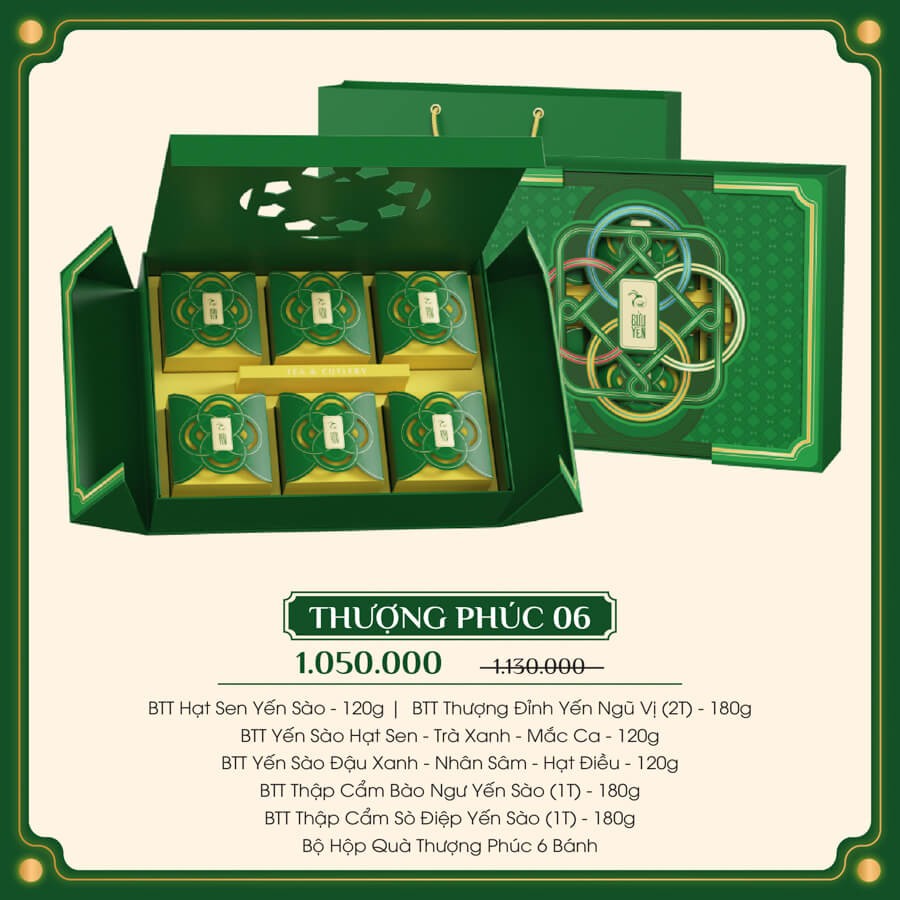 Thượng Phúc 06 – phiên bản hộp 6 bánh nằm trong bộ sưu tập “Thượng Phúc” của thương hiệu Bửu Yến, mang hình dáng như một rương báu mùa trăng, đựng đầy tinh hoa ẩm thực, nghệ thuật thiết kế và giá trị văn hóa truyền thống. Đây không chỉ là một món quà tặng trang trọng mà còn là biểu tượng của sự viên mãn, thịnh vượng và lời chúc phúc trọn vẹn gửi trao đến người thân, đối tác hay khách hàng trong dịp Tết Đoàn Viên.